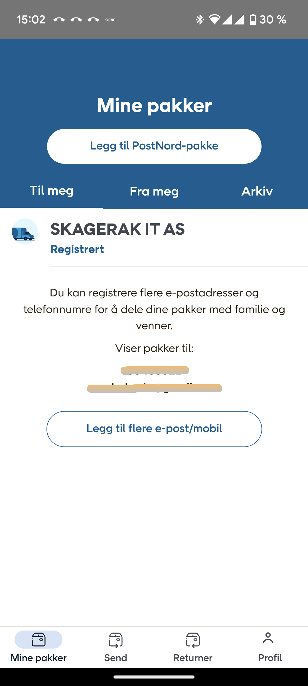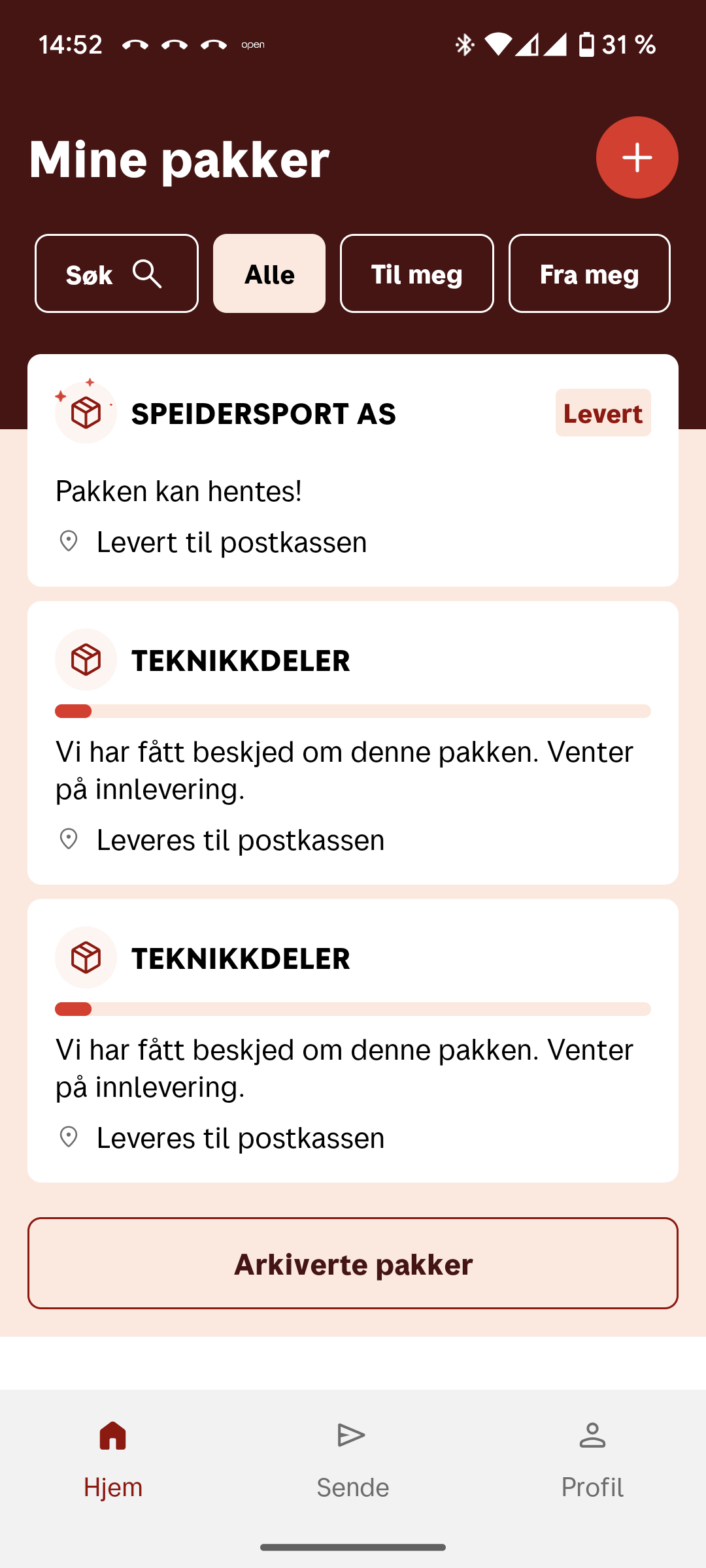 Her ser du dine pakker. Du kan se hvor langt pakken er kommet. Trykk på forsendelsen i bildet og du vil se alle detaljer. Er den klar for henting vil det stå hentested og leveringskode. Er den levert til en pakkeboks står det instruksjoner om hvordan du henter den.