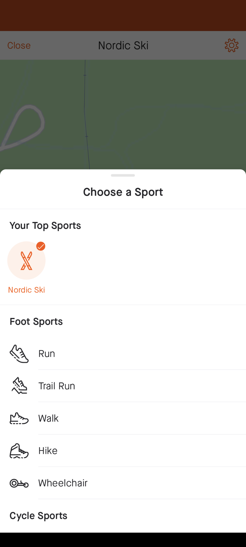 Listen er lengre enn det som vises her. Poenget er at du her velger hvilken aktivitet du skal starte med. Typisk langrenn, turgåing, sykling.