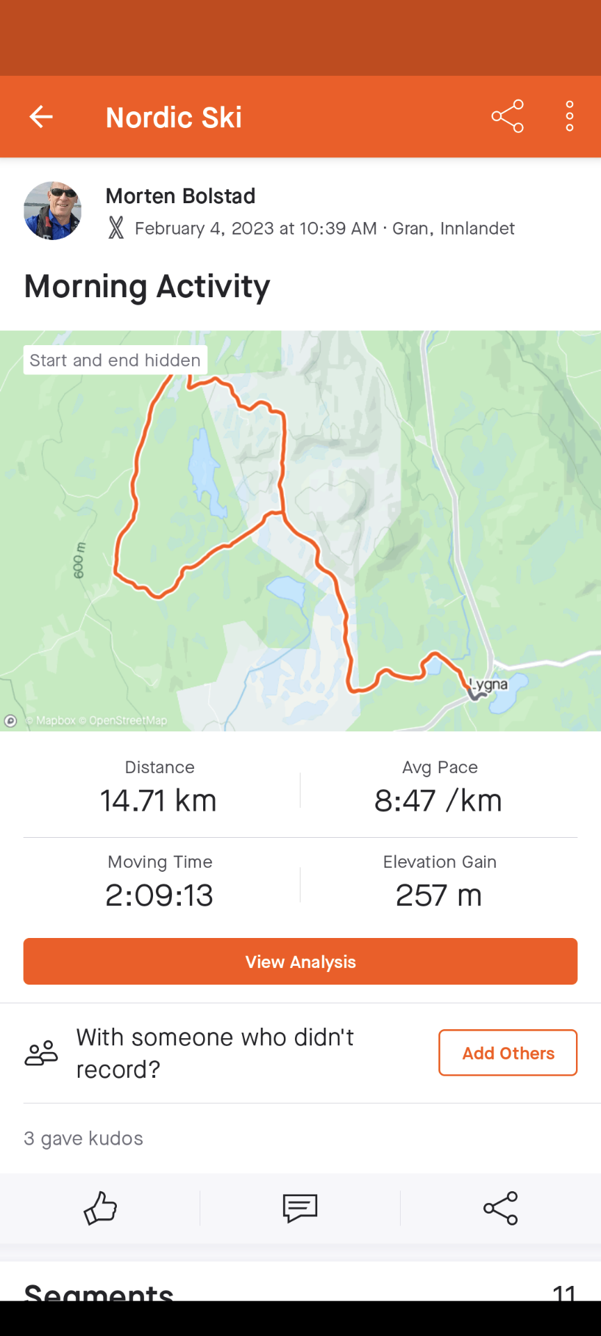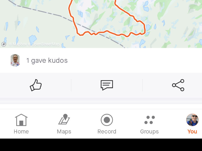 Vi ser på bildet at “3 gave kudos”. Det er altså 3 av mine venner på Strava som ga tommel opp for min tur.