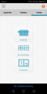 Åpningssiden til Strikke er oppskrifter. Noen av oppskriftene er gratis, andre koster penger. Vi skal se på «verktøy» som ligger nede til høyre. Under verktøy ligger omgangsteller, masketabell og øke- eller fellekalkulator.